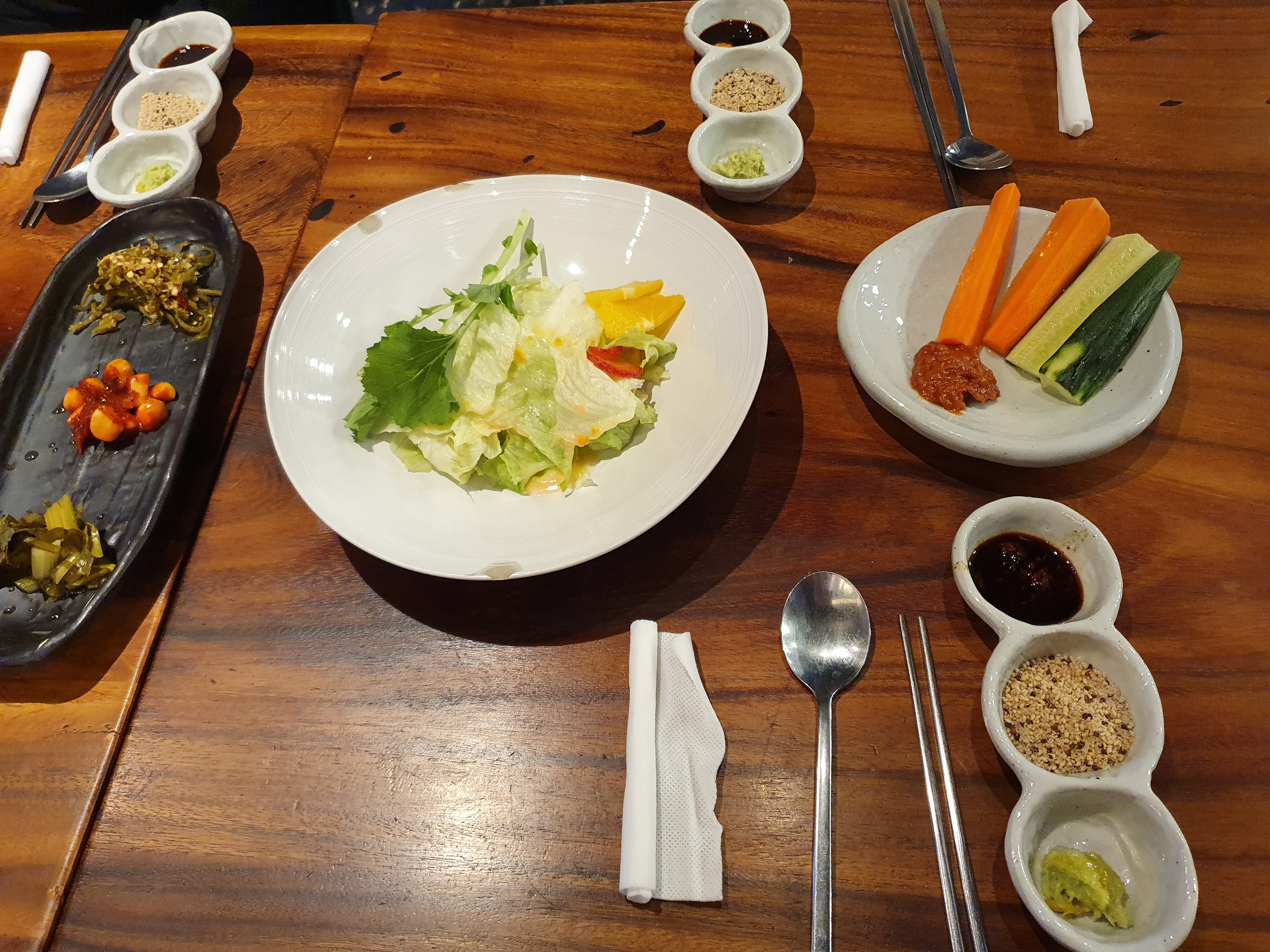 샐러드와 간단한 밑반찬과 소스들이 있었어요!