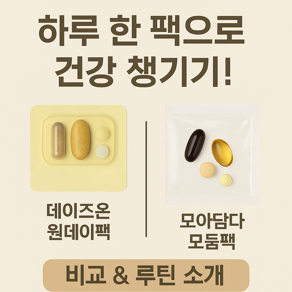 데이즈온 원데이팩과 건강을 모아담다 모듬팩의 성분과 특징을 비교하고, 하루씩 번갈아 먹는 루틴까지 소개해드립니다. 부담 없이 실천할 수 있는 건강관리 팁, 지금 확인해보세요!